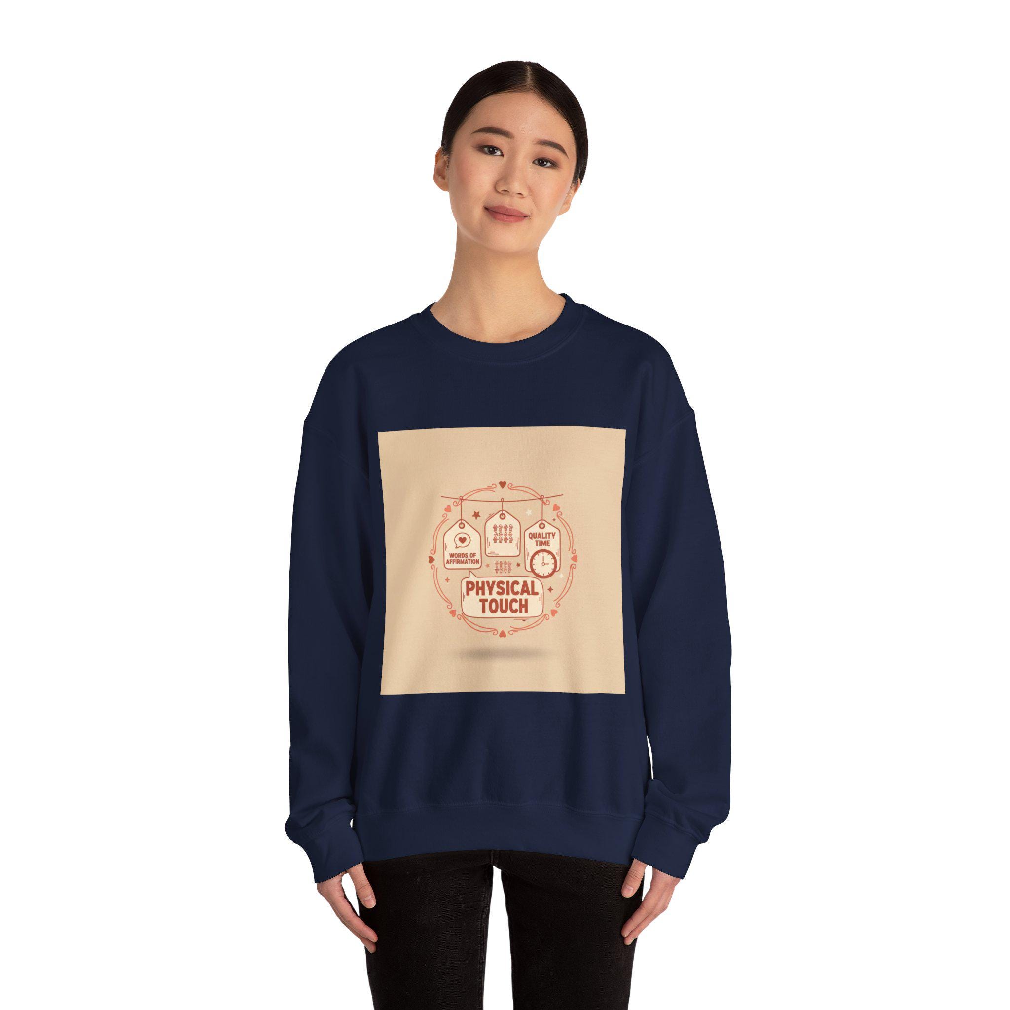 Quiet-love meme sweatshirt: clean, friendly type and tiny icons rework the “love languages” idea into cozy, laugh-out-loud everyday humor. A warm neutral block anchors a simple circular layout with four petite icons and the label “physical touch” rendered in approachable, legible type — the design reads quickly and functions like an identity badge for couples, roommates, or anyone who enjoys relationship humor. The muted palette and single accent color keep the vibe soft and wearable, matching the trend’s warm-neutrals and short, list-like aesthetic.