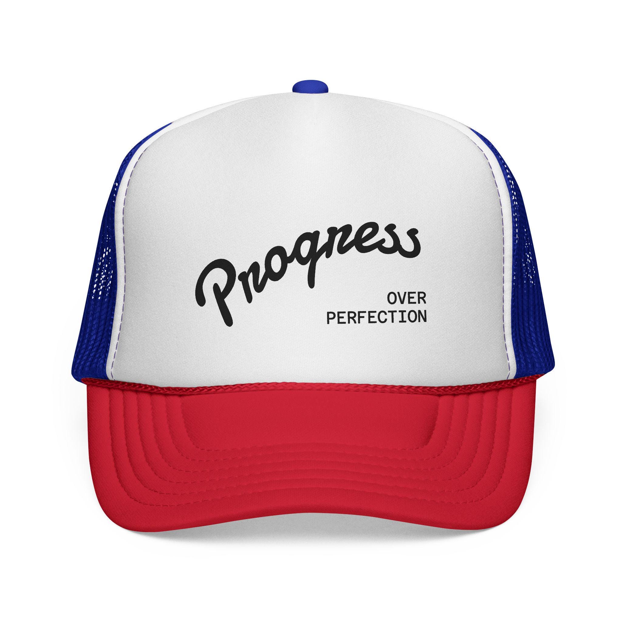 Lightweight, breezy, and unapologetically optimistic — this trucker cap carries a quiet reminder: progress over perfection. The foam-front crown gives a clean canvas for the embroidered script, while the breathable nylon mesh back keeps your head cool on long days outdoors or on the move. The slightly curved visor and reinforced six-row stitching hold their shape, and the adjustable snap closure lets you dial in a comfortable fit. Wear it to signal steady growth, to soften the pressure of daily hustle, or to bring a friendly, vintage-inspired touch to casual weekend looks.