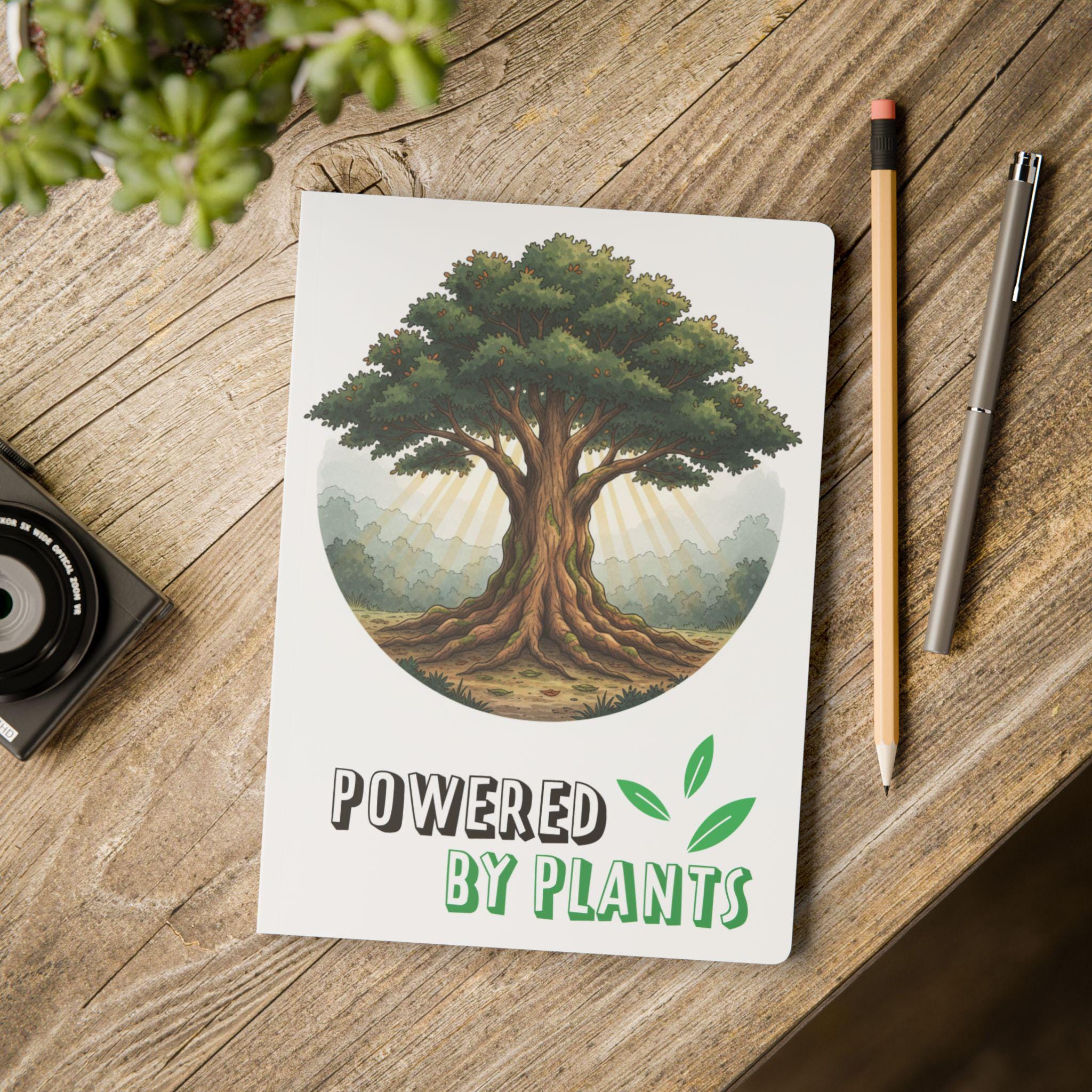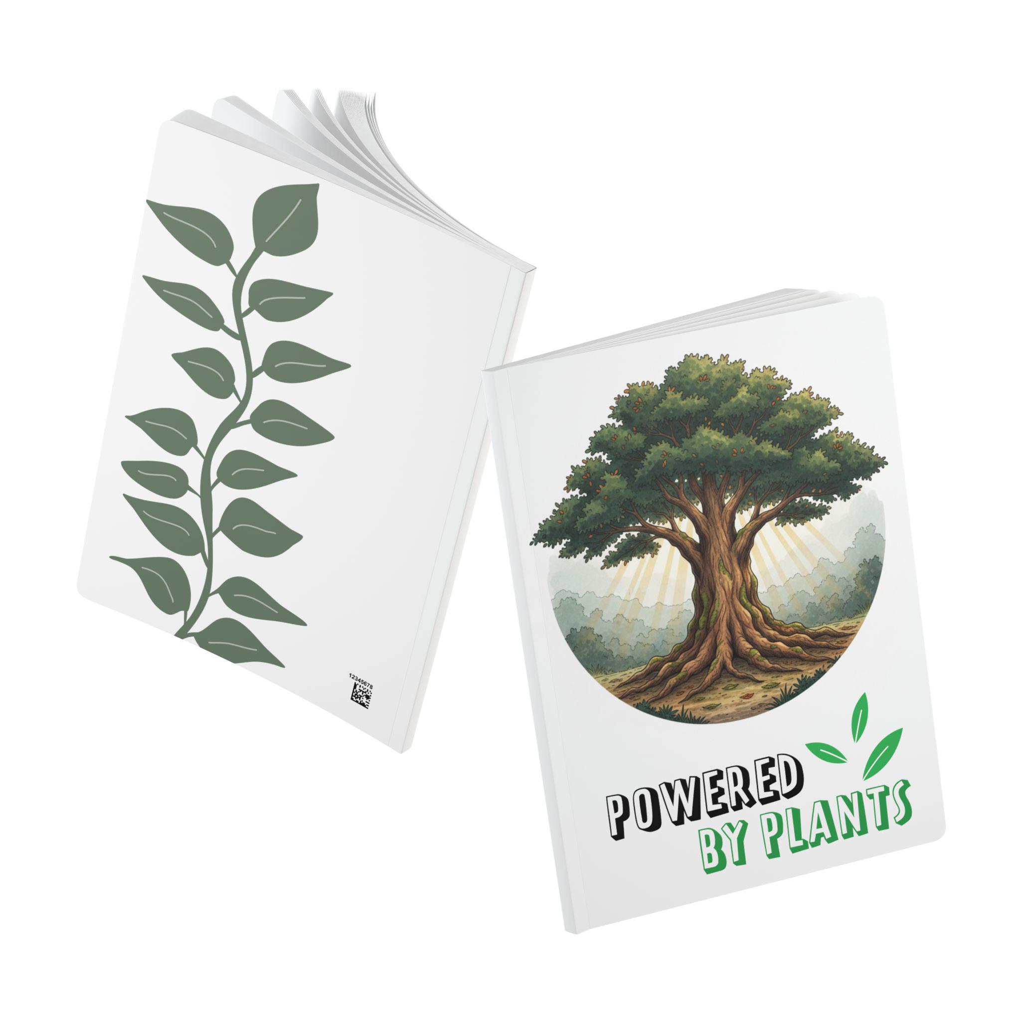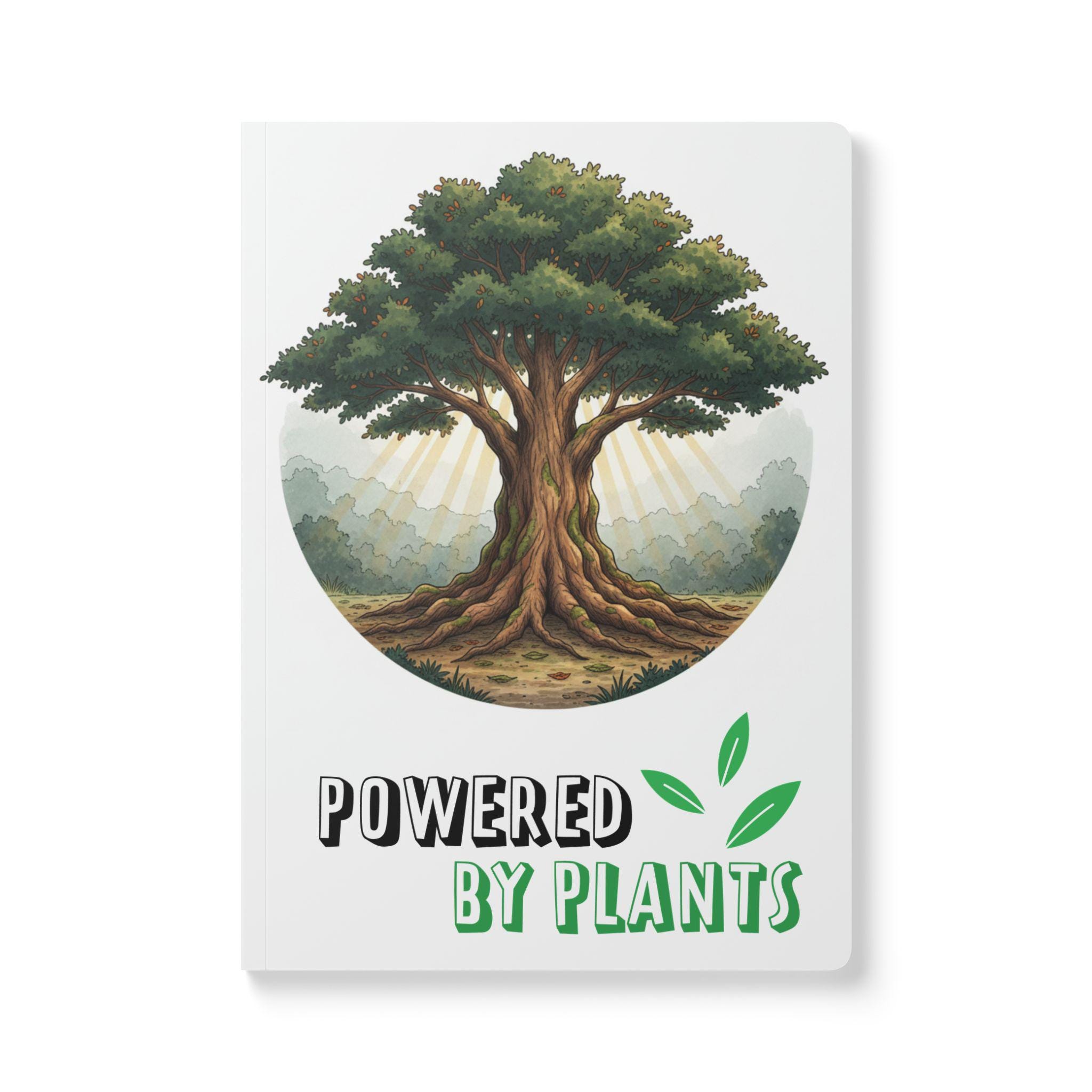 A softcover journal that brings the calm and energy of greenery to every page. The cover art features a stately, sunlit tree with roots and leaves rendered in vibrant, crisp color—below it a playful “Powered by Plants” message and delicate leaf accents. Inside, pale green vine motifs continue the theme across inner prints, turning notes, lists, and sketches into a small ritual of growth. The satin-finish cover and rounded corners give it a gentle, tactile feel in the hand. Perforated pages let thoughts be shared or removed cleanly, and the option of 100 or 200 pages makes it easy to choose a compact daily companion or a longer-term project notebook. Thoughtfully assembled in the USA from globally sourced parts, this journal fits into slow, intentional routines where creativity and plant-loving values meet.