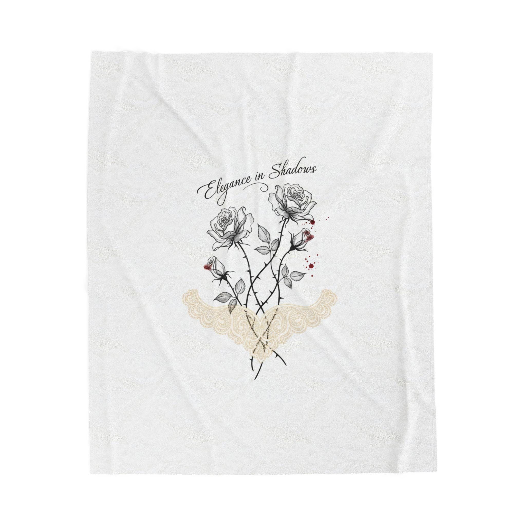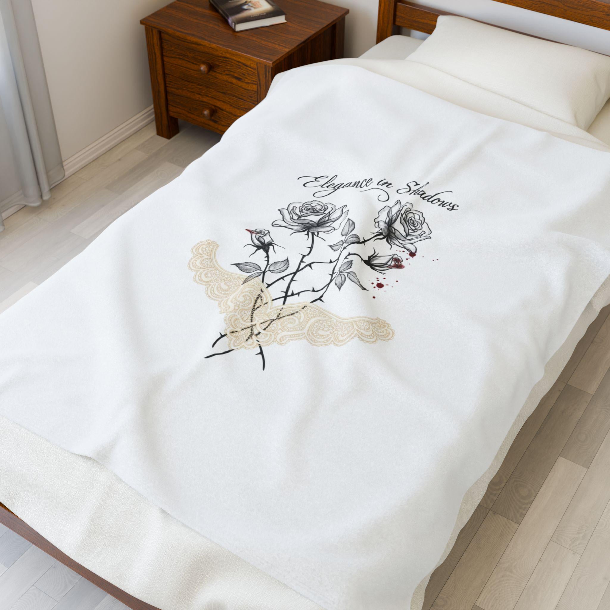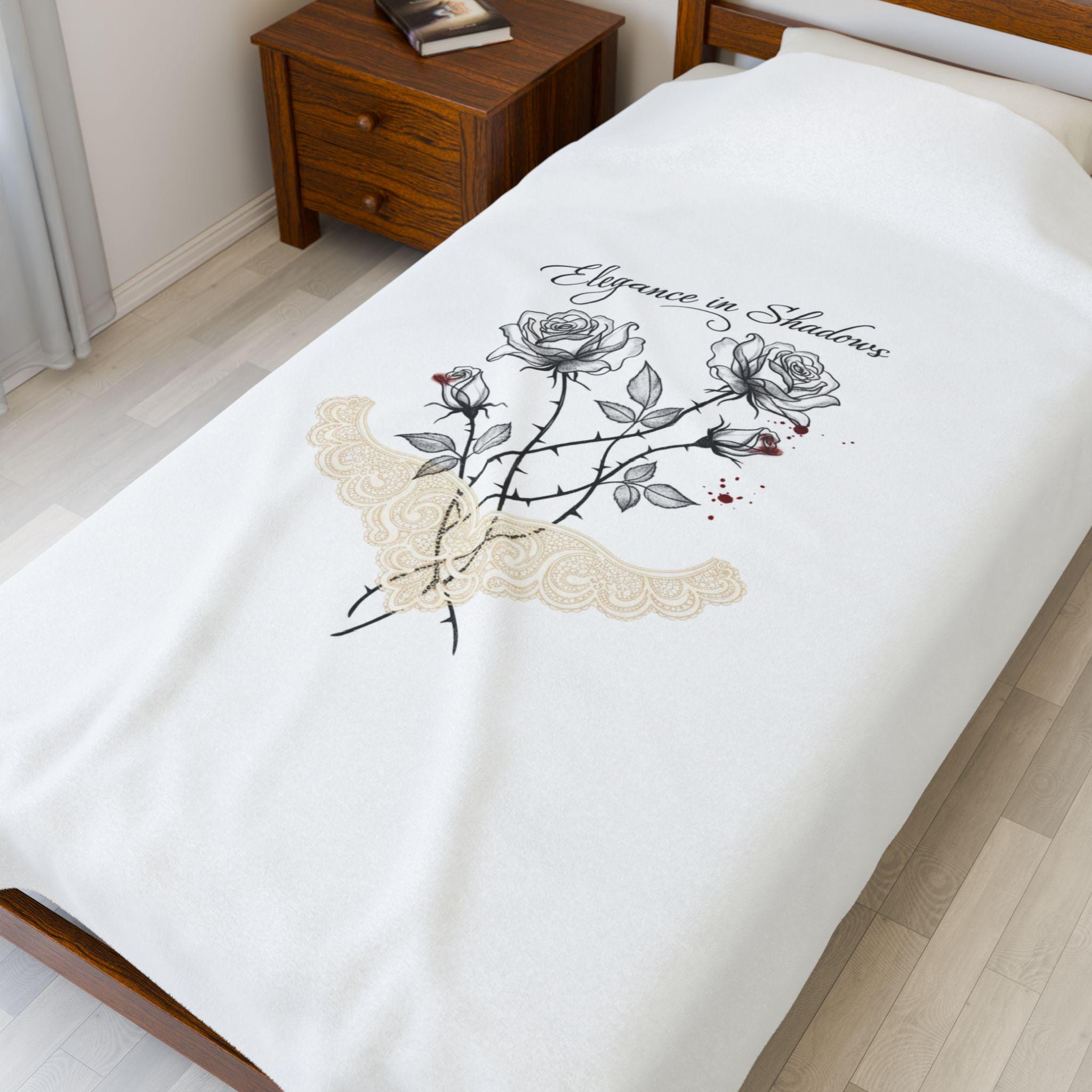 A soft, medium-weight velveteen blanket featuring a restrained dark-romance illustration of two delicate black-and-gray roses, graceful thorned stems, and an understated lace-like motif beneath. The artwork reads as moody and intimate with fine linework and a small accent of muted red, aligning with romantic-gothic-lite and soft goth aesthetics. Cozy enough for quiet evenings, it brings an elegant, minimal gothic touch to bedside layers or a reading nook without heavy ornamentation.