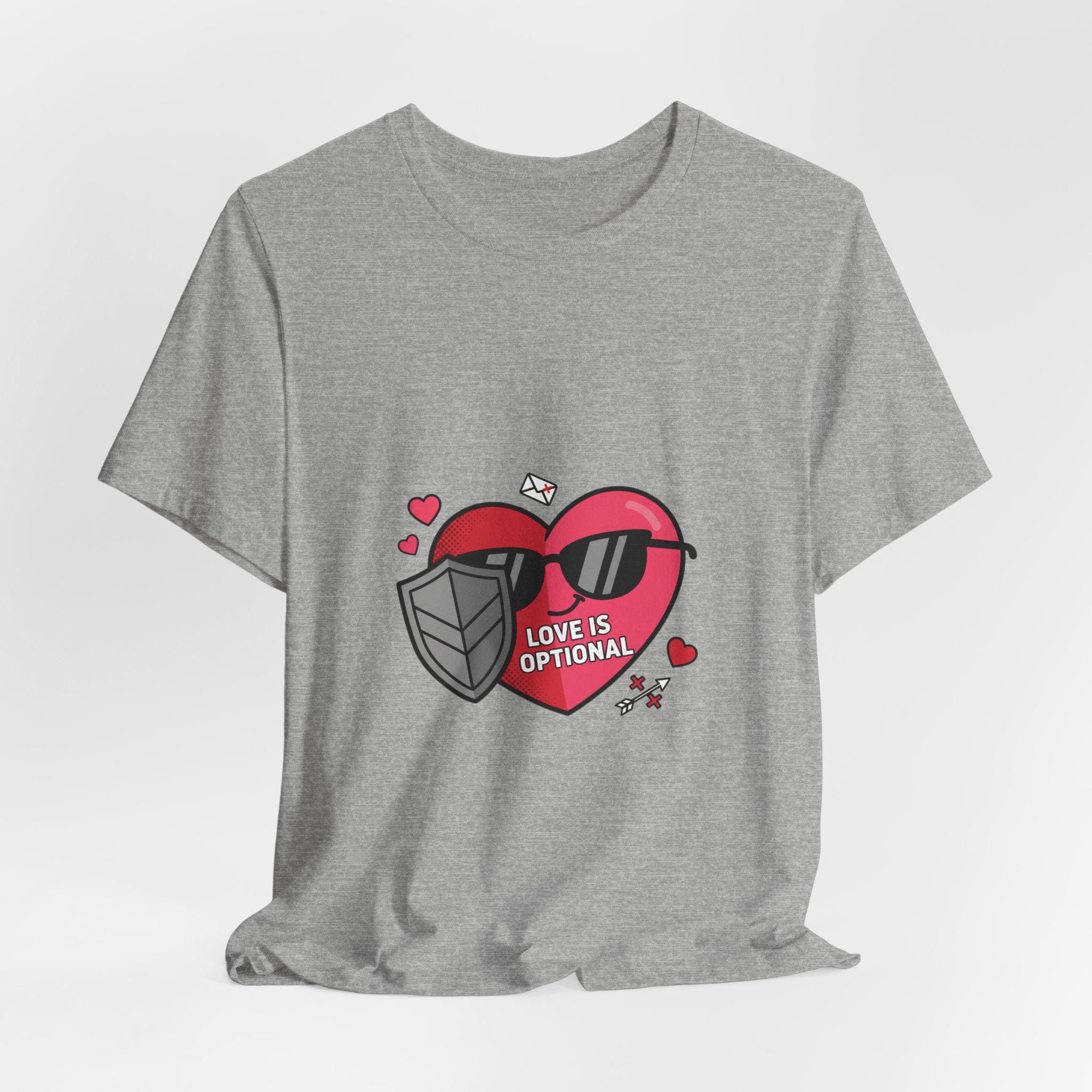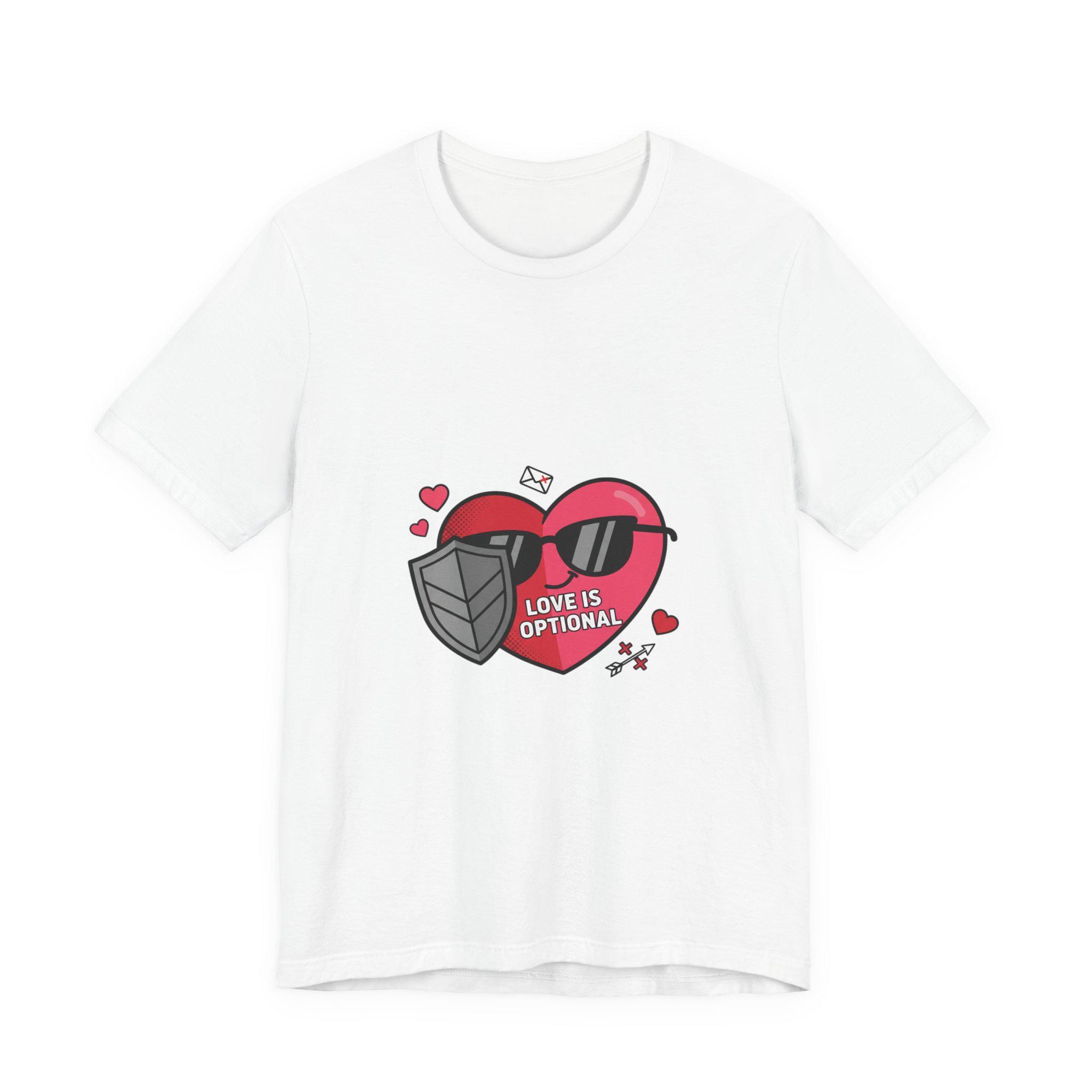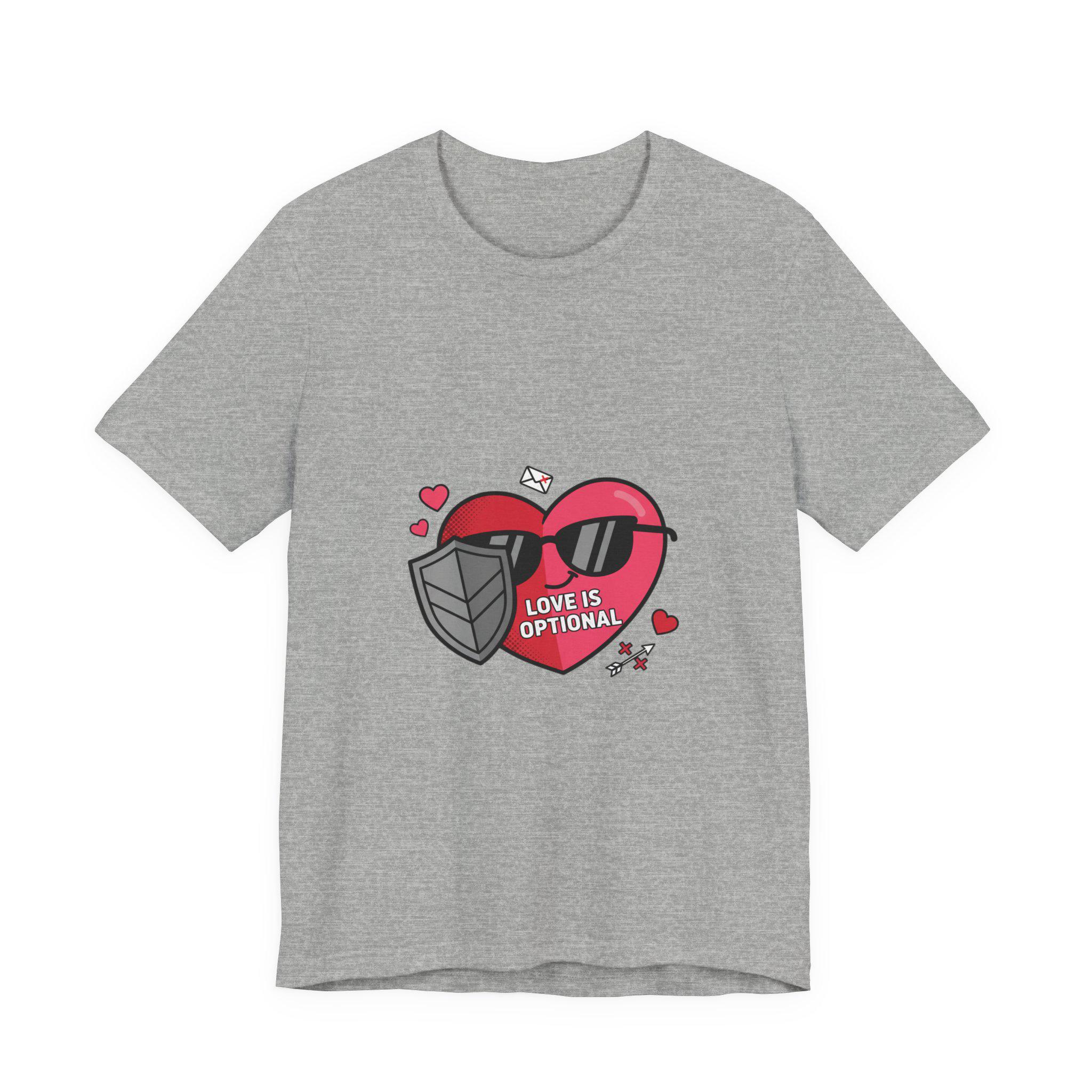 Express your rebellious side with the Love Is Optional cotton tee, a perfect blend of edgy humor and modern style. This anti-Valentine graphic shirt features a playful yet guarded heart wearing sunglasses and a small shield emblem, boldly proclaiming "love is optional." Designed for those who embrace the dark heart trend, it combines soft pink and red hues with sharp black linework, creating a striking contrast that’s both cute and snarky.