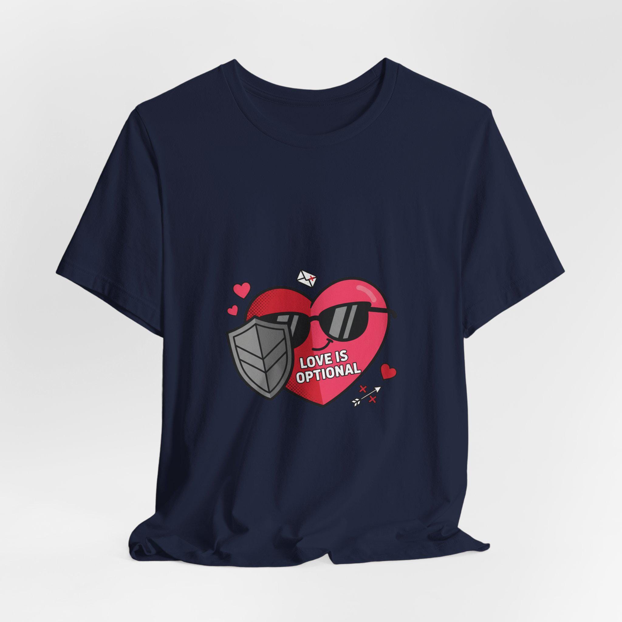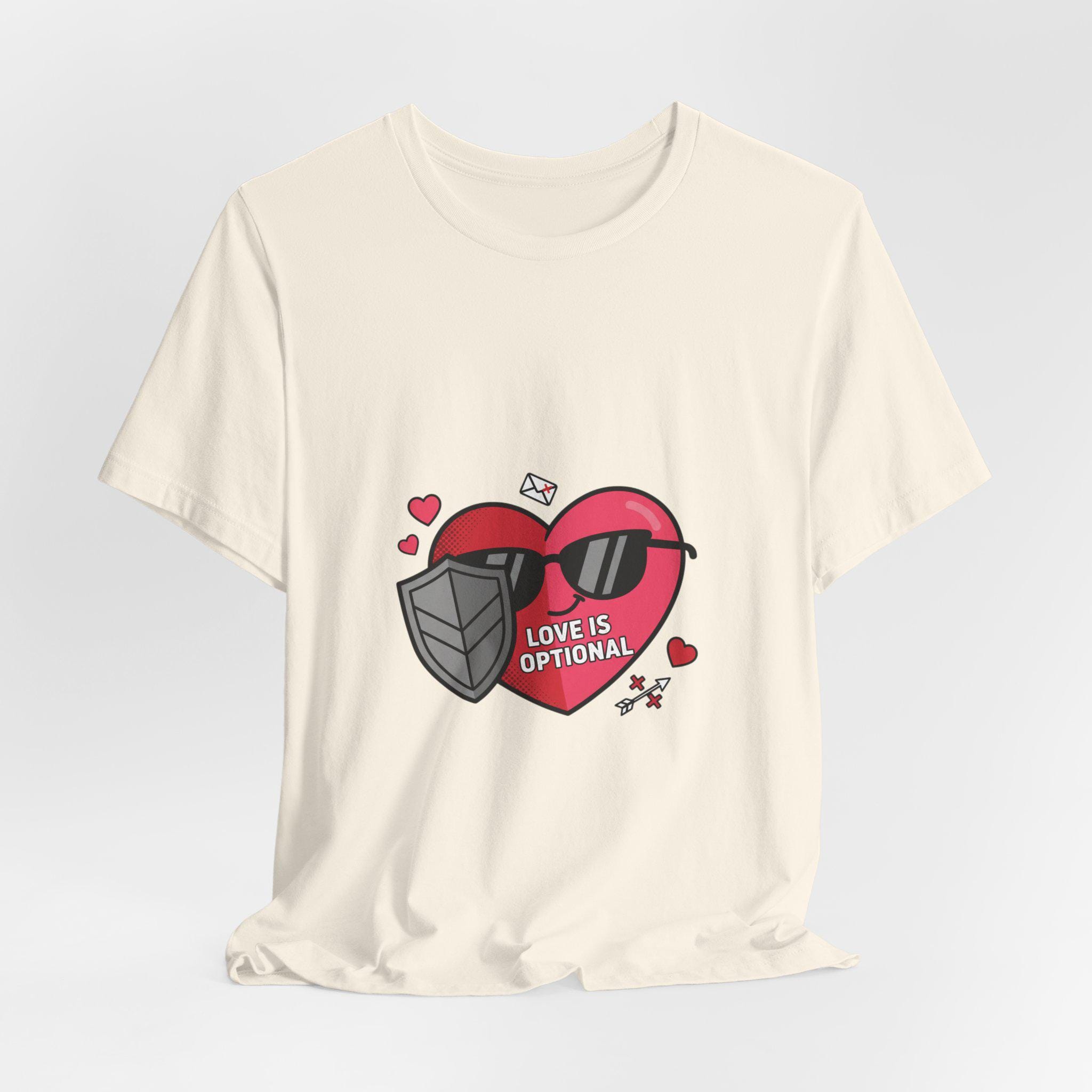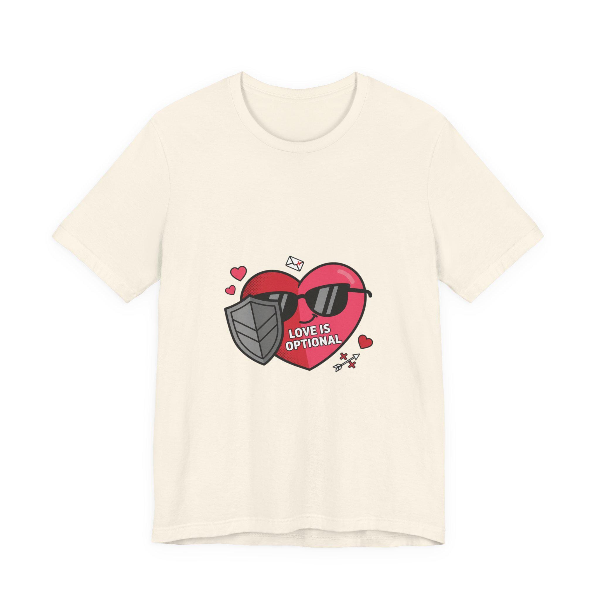Express your rebellious side with the Love Is Optional cotton tee, a perfect blend of edgy humor and modern style. This anti-Valentine graphic shirt features a playful yet guarded heart wearing sunglasses and a small shield emblem, boldly proclaiming "love is optional." Designed for those who embrace the dark heart trend, it combines soft pink and red hues with sharp black linework, creating a striking contrast that’s both cute and snarky.
