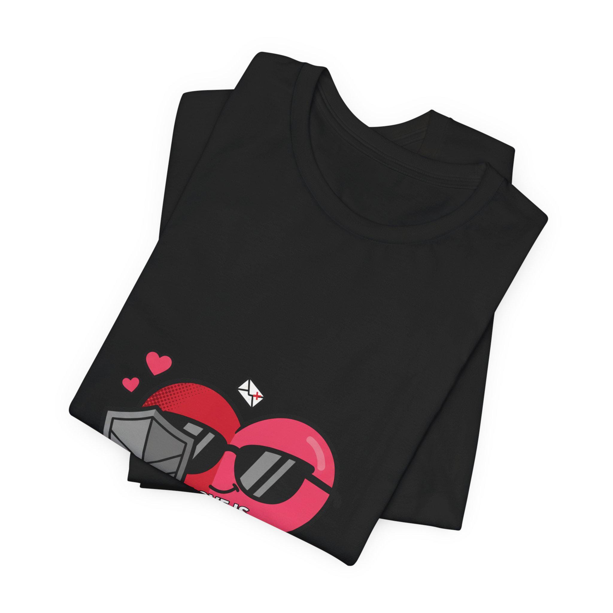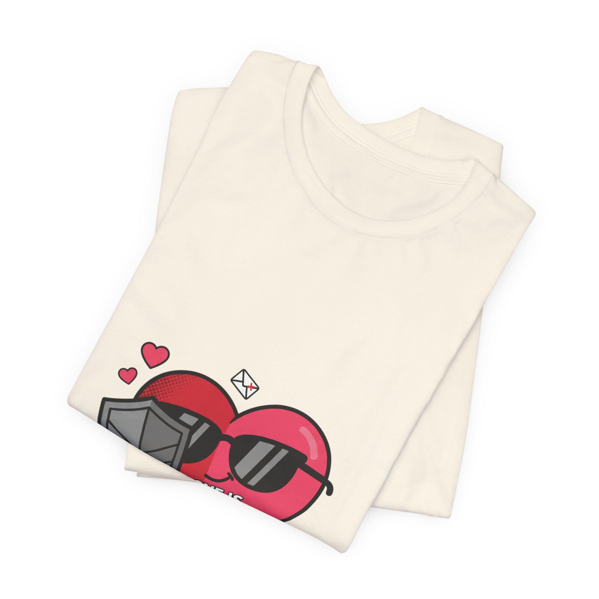 - Features a bold graphic with a guarded, tongue-in-cheek heart wearing sunglasses and a shield