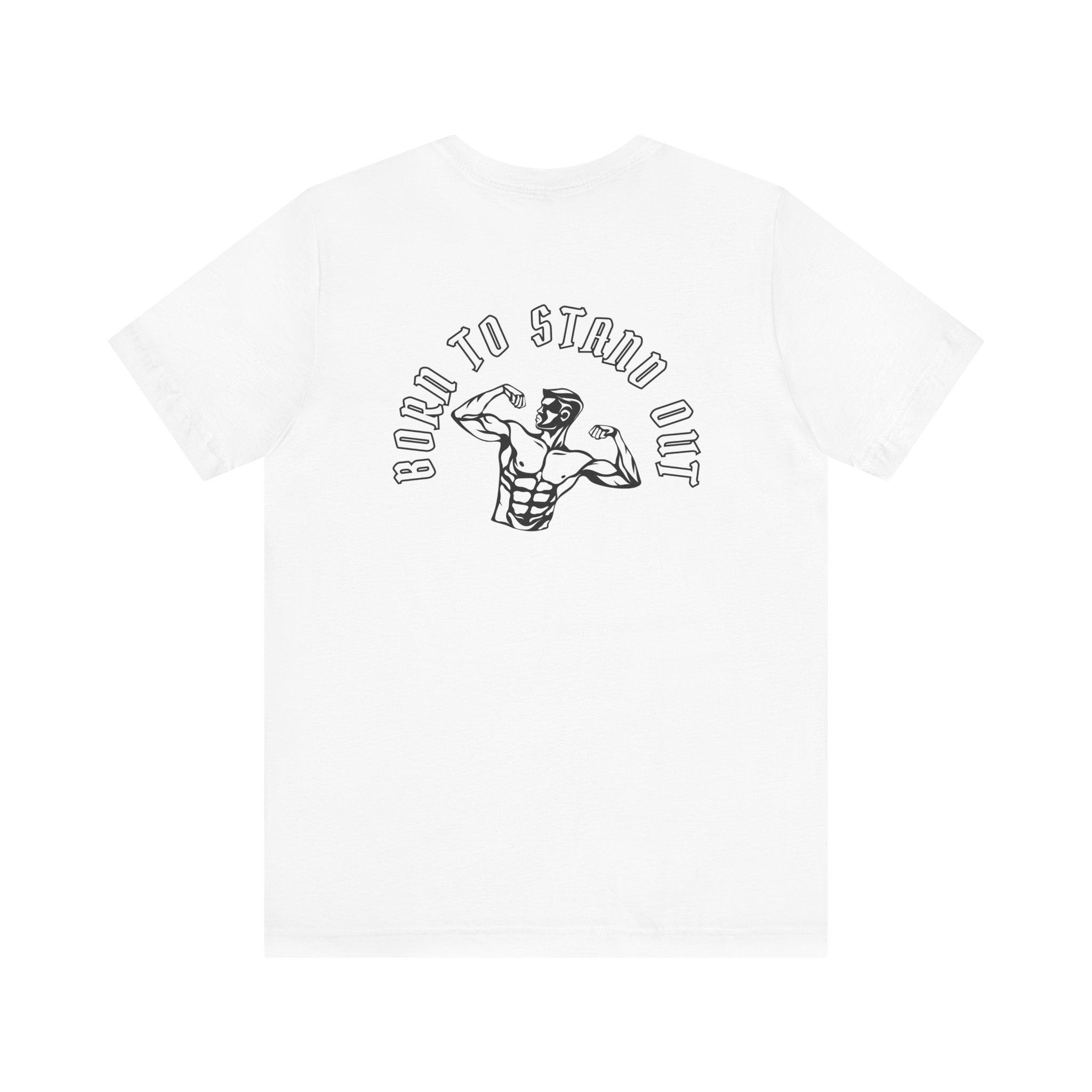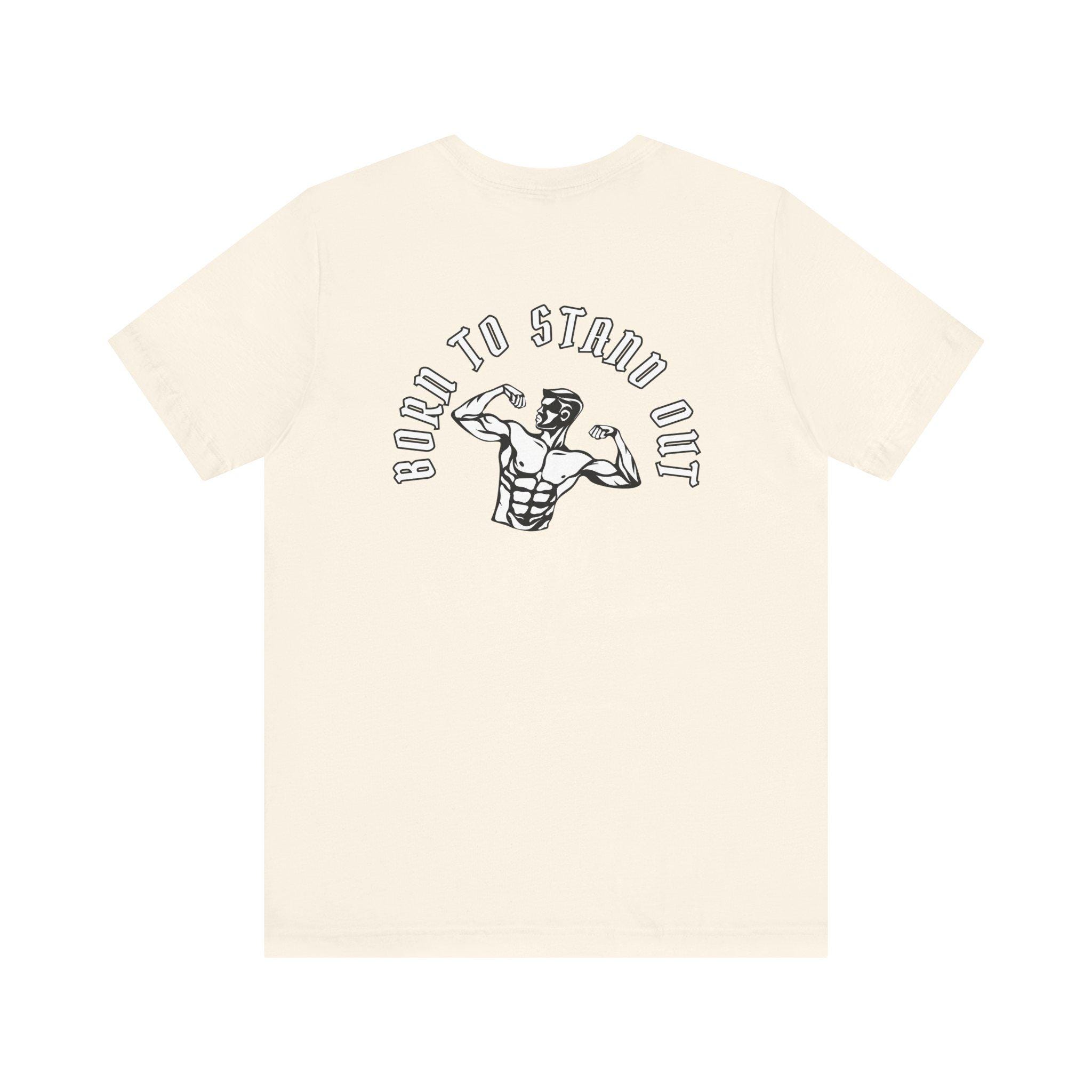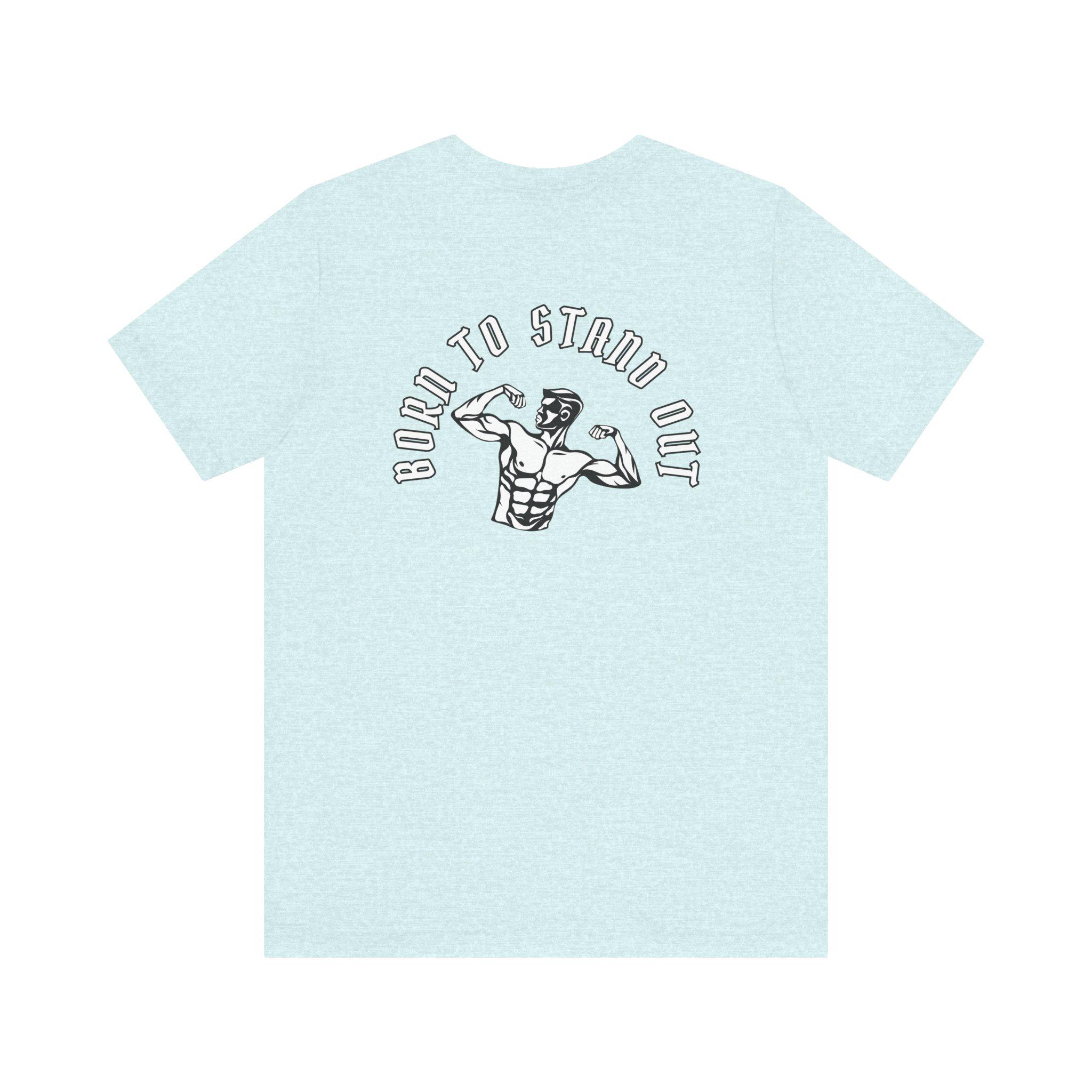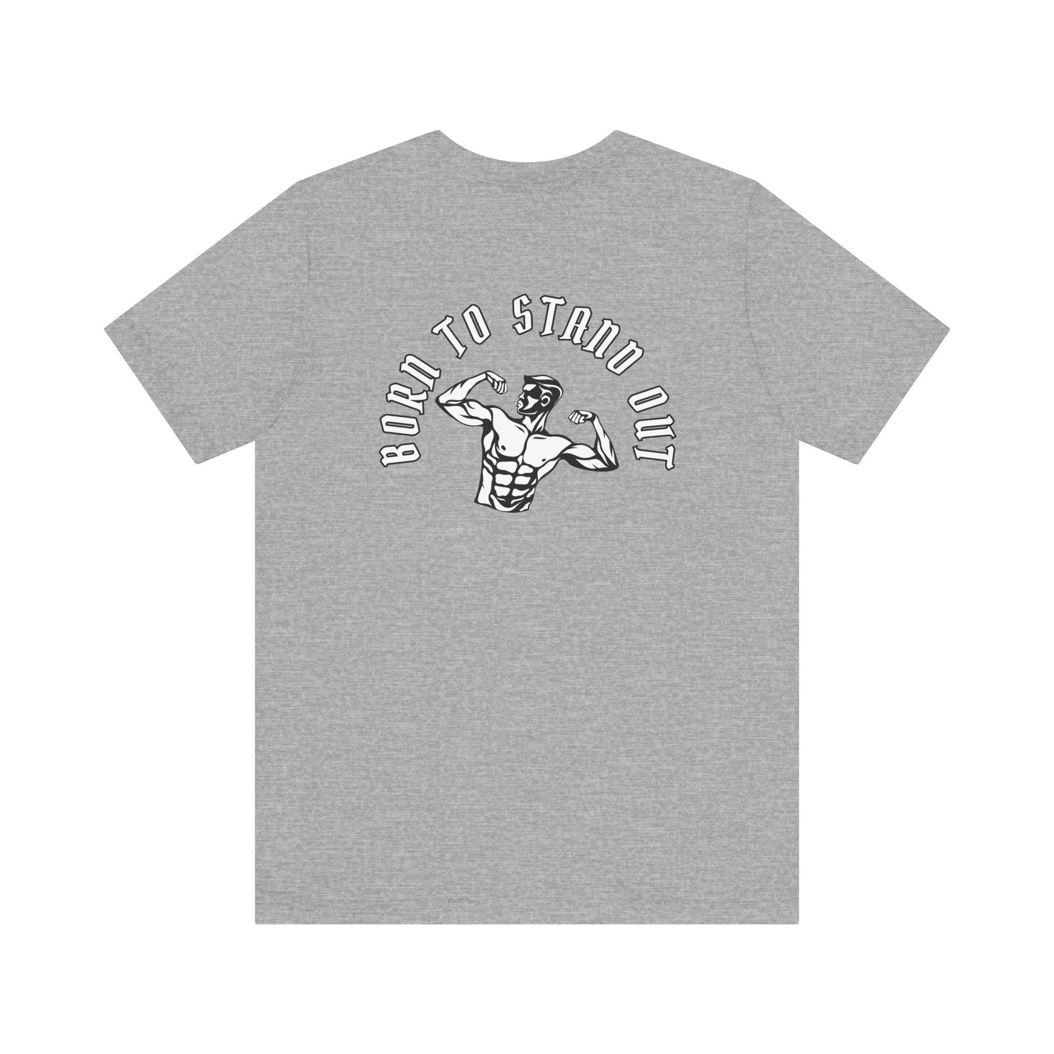 This lightweight crew-neck tee brings gym energy into everyday wear. Soft, airy Airlume cotton and a retail cut make it comfortable for warm-ups, workouts, or running errands. Front icons—dumbbells, shaker bottle, and a heart-with-barbell—speak to a focused, balanced training life; the back shows a flexing silhouette under the arched phrase “BORN TO STAND OUT,” turning the shirt into a low-key statement piece. Breathable fabric and a tear-away label keep you focused on movement, while reinforced seams and a ribbed collar hold their shape session after session.