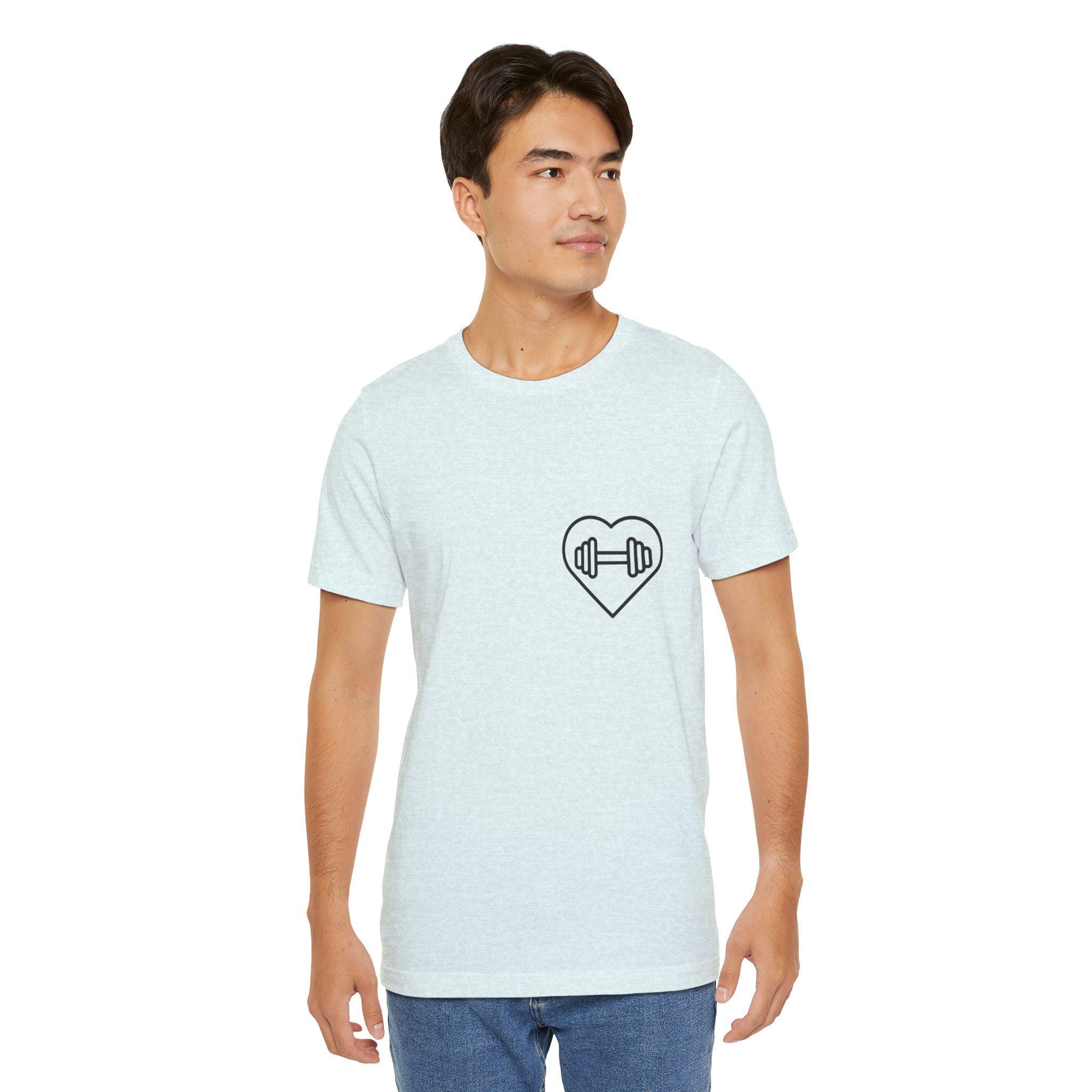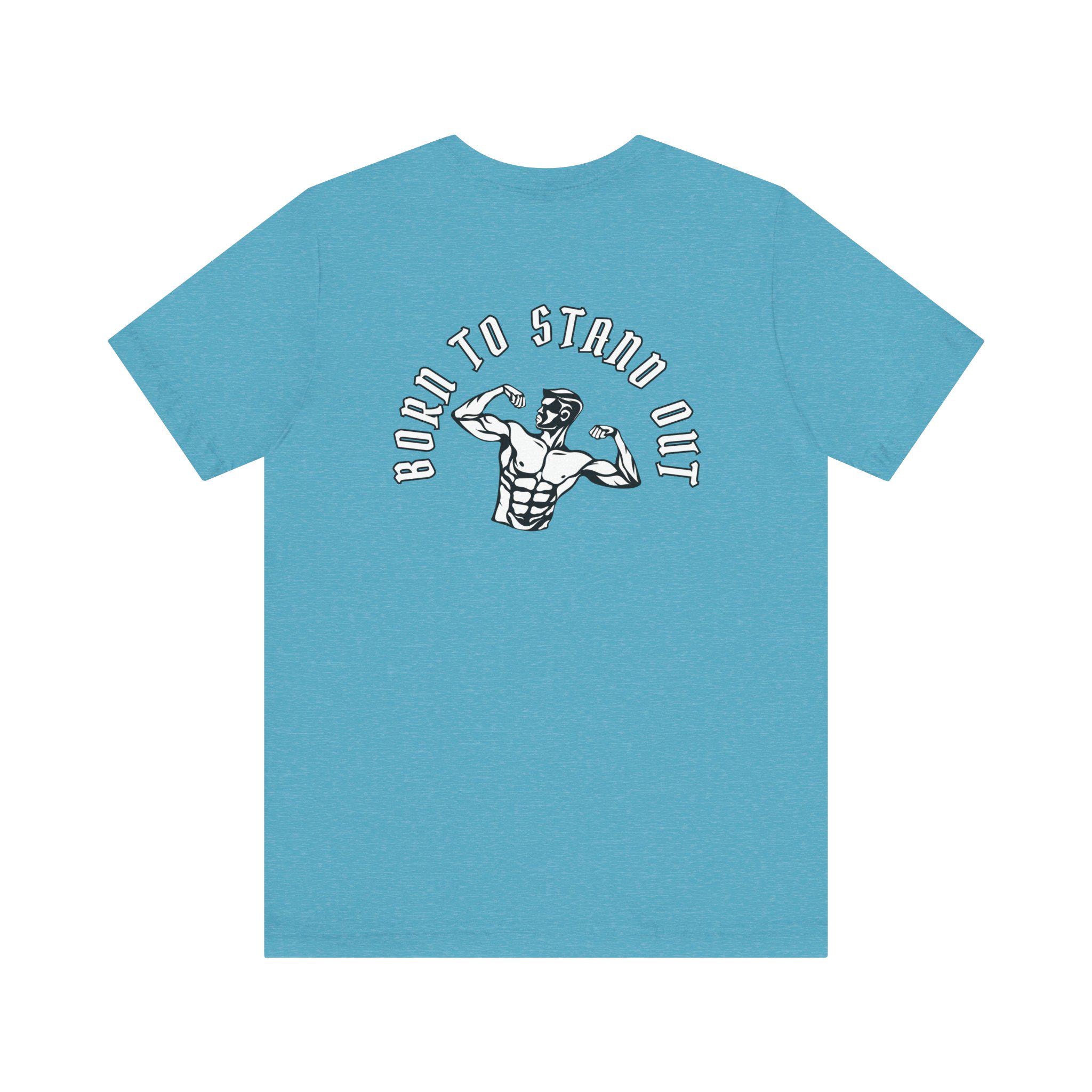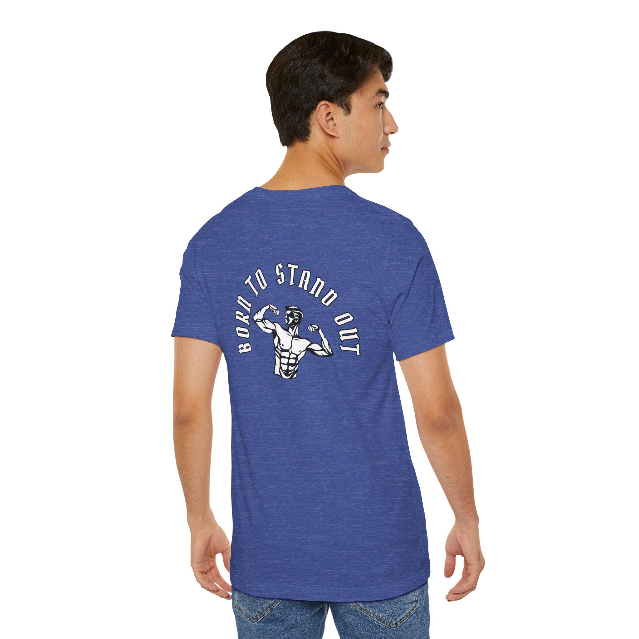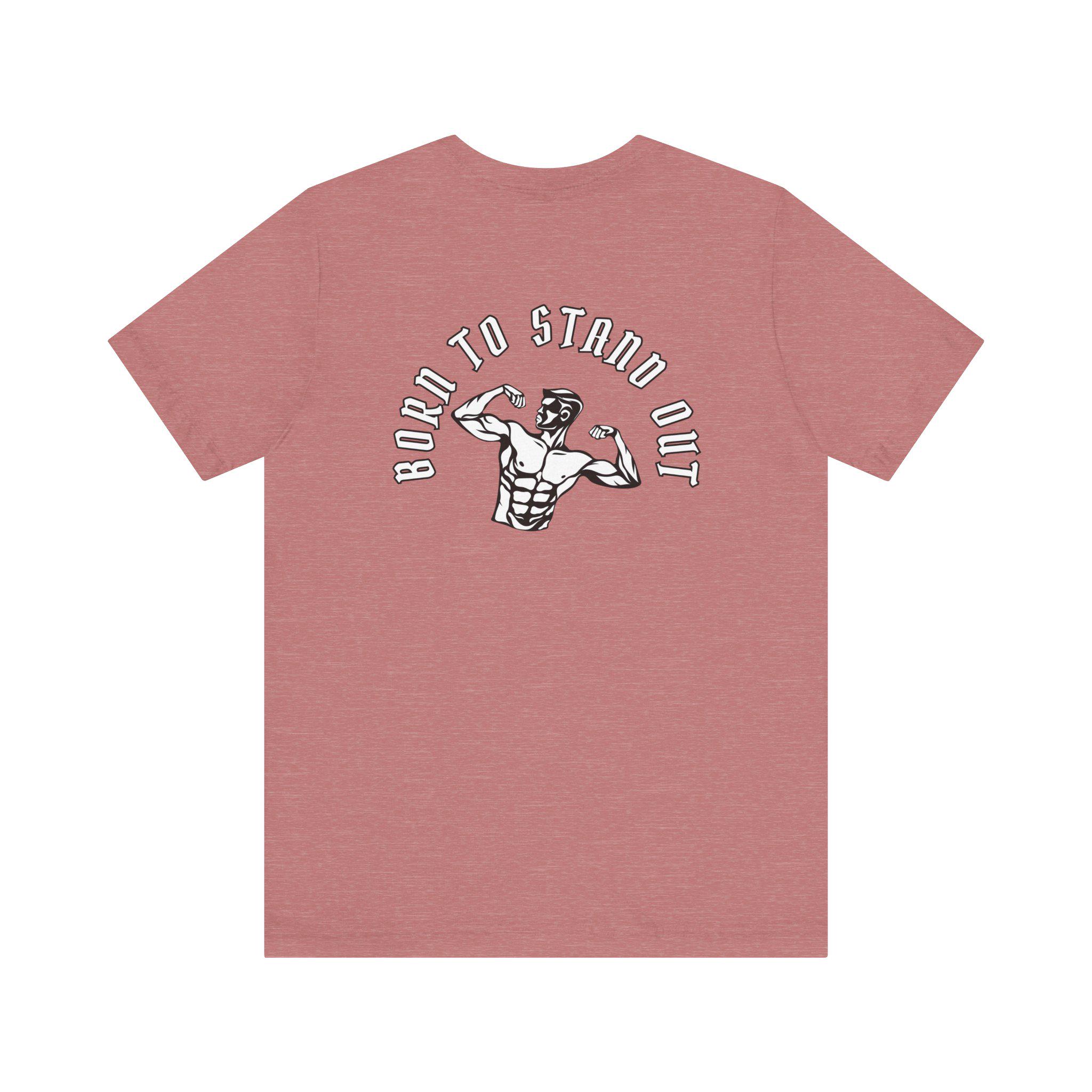 This lightweight crew-neck tee brings gym energy into everyday wear. Soft, airy Airlume cotton and a retail cut make it comfortable for warm-ups, workouts, or running errands. Front icons—dumbbells, shaker bottle, and a heart-with-barbell—speak to a focused, balanced training life; the back shows a flexing silhouette under the arched phrase “BORN TO STAND OUT,” turning the shirt into a low-key statement piece. Breathable fabric and a tear-away label keep you focused on movement, while reinforced seams and a ribbed collar hold their shape session after session.